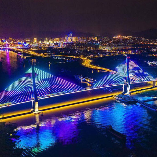 橋梁全彩LED燈光是通過安裝帶DMX512控製芯片的91香蕉APP在线观看,再通過電腦、控製器進行編程,使燈光能按程序展現不同效果,常用效果有炫彩、跑馬、漸變、像素屏。應用場景:橋梁香蕉视频免费大全工···