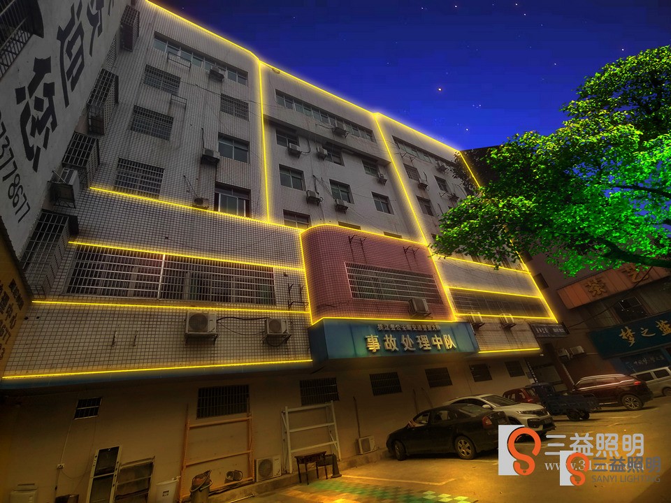 桃江縣公安交警大隊、事故入處理中心外牆燈光設計方案,采用線條燈勾勒大樓輪廓。